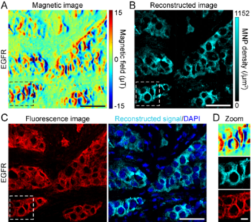 传统磁共振成像受限于低灵敏度和低空间分辨率,很难应用于组织水平微米分辨率的成像。宽场NV显微镜结合量子精密测量与免疫磁标记技术,能够实现高分辨率的肿瘤组织磁成像,可用于肺癌等检测。